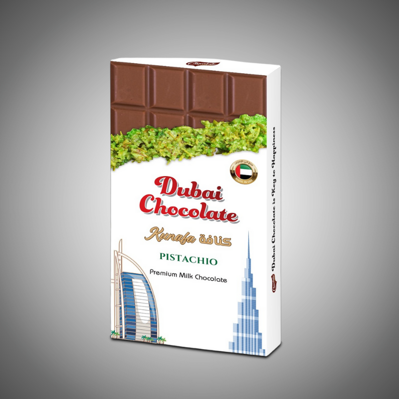 Refined and indulgent, the White Edition Kunafa Pistachio Chocolate is the epitome of Dubai luxury gifting. Made with smooth milk chocolate and layers of crisp kunafa enriched with pistachios, this bar offers a light yet flavorful taste. Its clean, white packaging with Dubai’s iconic landmarks adds a touch of elegance — perfect for weddings, souvenirs, or thoughtful presents for chocolate connoisseurs.